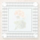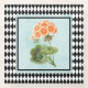 Pretty Geranium botanical style illustration on distressed light denim background with black and white harlequin pattern frame.
