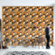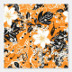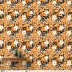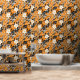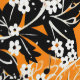 A seamless pattern featuring large white flowers, tiny white flowers, black leaves, and small black music notes on an orange background. The design has a hand-painted appearance, blending floral elements with musical motifs to create a harmonious and artistic composition.
