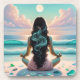 Beautiful ai art depicting a gorgeous woman meditating on the beach with pina and blue clouds, ocean waves, white sand and sea glass.
