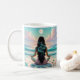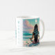 Beautiful ai art depicting a gorgeous woman meditating on the beach with pina and blue clouds, ocean waves, white sand and sea glass.