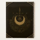 Harmony of the elements: moon, gold and geometry. Where the secrets of the universe lie hidden, a crescent moon rises with a surface that reflects the light of the stars in a golden glow. The moon sits majestically in a circular frame that acts like a protective circle, while golden lines stream from its centre like rays of sunlight, piercing the darkness. The deep black background enhances the contrast with the glowing golden elements and creates an atmosphere of mysticism