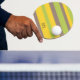 Three-color design with harmonious stripes. Horizontal lines in three strong colors for your table tennis racket and Ping Pong paddle. Add your name or text. This variant is the bright color scheme in brown, yellow and green.
