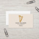 A minimalist business card featuring a gold harp illustration on a cream color background. A great idea for harpists, musicians, teachers, instructors or concerts.