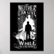 A fearsome prophecy that connects the Dark Lord Voldermort with our heroic Harry Potter. 'Neither can live while the other survives' ' a chilling revelation illustrated in a shadowy silhouette with these famous kids book characters. A cool, dark background display with the magical power to bring this Harry Potter quote to life with the witches and wizards that inspired it.