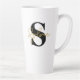 This custom monogrammed mug features a black and gold colored pumpkin with floral accents over a gold colored double hexagon frame. The monogram on the other side can be customized with any letter or name. The font and text colors may be customized as well, and the images may be adjusted for size or placement.