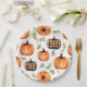 A charming autumn tableau featuring a medley of pumpkins in warm, earthy tones. The design blends classic orange gourds with whimsical plaid patterns, nestled among delicate green and brown foliage. Rendered in a soft watercolor style, the composition evokes the cosy spirit of fall—perfect for celebrating the season’s natural beauty and festive ambiance.