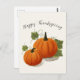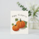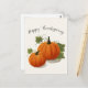 This elegant design features a hand-painted style illustration of two richly colored orange pumpkins nestled among green, curling vines and leaves. The sentiment, "Happy Thanksgiving," is written in a delicate, flowing script that adds a touch of classic charm.
