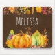 Personalised mouepad with a watercolor illustration of pumpkins, acorns, mushrooms and seasonal autumn leaves. A border along the top also composed of autumn leaves, berries, acorns, and other foliage. Dark brown watercolor background.