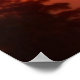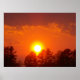 We see the sun and its fiery brilliance light up the sky with colours of purple and orange as it exits behind the treeline for the evening in this print.