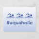 #aquaholic. Can't get enough of the pool? Then this is the postcard for you - and for everyone who really loves swimming. The text is in blue, with three blue pictogram swimmers above, on a pale blue gradient background.