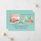 This soft teal background, with a heart pattern, features two photo windows and two chicks in love. Well-suited for a sibling to introduce the new arrival. A cute birth announcement for a lesbian couple.