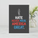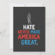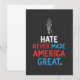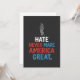 This striking design features the iconic phrase “HATE NEVER MADE AMERICA GREAT” in bold, hand-painted red and blue lettering—echoing the colors of the flag, but standing firmly against division. Above the text, a white line-art hand holds a flaming torch—symbolizing truth, liberty, and the light of hope.