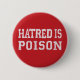 A medium (2.25-inch) pin-back button reading "HATRED IS POISON" in white stitched-font letters on a red background.