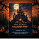 This Halloween invitation casts a spell with its moody, gothic castle scene bathed in moonlight, surrounded by glowing jack-o'-lanterns and twisted trees that set a perfectly eerie tone. The design uses a mix of fonts to heighten the drama: a bold, distressed serif for the event title that channels vintage horror vibes; a whimsical handwritten script for the tagline that adds playful flair; a clean sans-serif for the party details to keep things readable; and a stylised uppercase serif for the date that feels ceremonious and slightly ominous. The layered typography mirrors the visual rhythm—spooky, cheeky, and unmistakably festive.