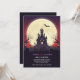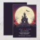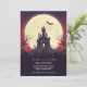 A classic Halloween invitation featuring a haunted castle, twisted trees, and flying bats for a spooky night.