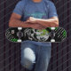Dd brand urban decay looking skateboard done black with a distressed haunting white and black clown face, with white and neon green accents.