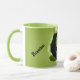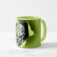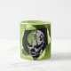 Green ceramic mug, with graphics of a ripped hole, in the middle, and a creepy black and white clown face peeking out. Personalise the black text to suit your needs.