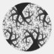 This haunting set of round stickers was created from a fractal. It resembles a cluster of black trees with black trunks and twisted branches against a white moonlit night sky. It looks as though you are lying on the ground looking up at the sky from within a dense and spooky forest. Let your imagination run wild.