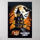 Step into the realm of spooktacular fun with this Halloween party poster that captures the essence of the night. A haunted house stands cloaked in mystery, its windows aglow with ghostly light. Bats take flight against the moonlit sky, adding an air of enchantment. Intricately carved pumpkins cast a flickering spell, while a bright full moon bathes the scene in eerie radiance. This poster embodies the bewitching allure of Halloween, where the haunted house, flying bats, carved pumpkins, and moon unite in a symphony of ghoulish delight.