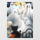 A spooky Halloween window cling featuring a haunting scene with a group of animated ghosts, a creepy mummy, and a mysterious black cat with glowing red eyes perched on a pumpkin. Perfect for creating a chilling atmosphere in your home or at Halloween parties.