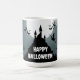 Sip into the spirit of Halloween with this eerie mug featuring a haunted castle silhouetted against a glowing full moon. Bats flutter, a witch soars across the sky, and twisted trees frame the scene, all set atop a shadowy hill with bold “HAPPY HALLOWEEN” lettering. Perfect for spooky season sips, haunted house vibes, or gifting to your favourite Halloween enthusiast.