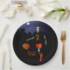 Not into trick-or-treating on Halloween?  How 'bout a little pickup game of hoops?  Features a skeleton dribbling a Jack O'Lantern in pace of a basketball.  The skeleton is wearing a t-shirt emblazoned with the number "7" and team name "GHOULS." The moon hovers over a dark city skyline in the distance. Add your own text.