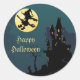 A Halloween designfeaturing a haunted house with a silhouette of a witch flying on her broomstick against the full moon. sgb01