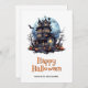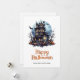 Halloween card featuring a haunted house, the full Moon, bats and a skeleton ghost. Easily personalise this watercolor Halloween card with your family name and text.