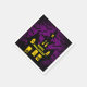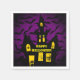 Paper party napkins for Halloween with image of bats against a purple sky and a haunted house with spooky spiders, cats and other scary surprises.