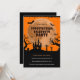 On an orange background, there are black trees, haunted houses, graveyards, and bats flying around a big full moon.