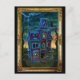 Spooky haunted house portrait scene with monsters creeping through the house, spooky eyes in trees on a Halloween night. A haunted owl is perched on the dead tree overlooking the electric storm approaching! Illustrated cartoon house features blue, green and red tones.