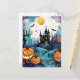 Halloween postcard featuring a watercolor illustration of a haunted mansion, the Moon, bats and jack o’lanterns.