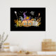 A poster with a cute image of a haunted pumpkin house with a big witches hat on top and ghosts and bats flying around.