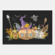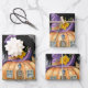 Wrapping paper sheets with a cute image of a haunted pumpkin house with a big witches hat on top and ghosts and bats flying around.