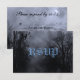 An editable response RSVP card template with grungy script and traditional gothic letters on a spooky Halloween sky with misty trees along a dark haunted road, ravens and a cloudy full moon and a blue tint. Customise It to change fonts, letter colours or sizing and more, even save your design for later.