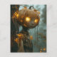 The image depicts a hauntingly beautiful illustration of a figure with a pumpkin for a head. The pumpkin is intricately detailed, with glowing eyes that emit a warm, golden light. Delicate strands of vines and wires are entwined around the pumpkin and the figure's neck, adding an eerie yet enchanting effect. The figure is dressed in a tattered, earth-toned outfit that blends seamlessly with the autumnal environment. The background features a misty forest with softly glowing lights and falling leaves, creating a mysterious and magical atmosphere.