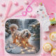 A fluffy Havanese dog playfully entangles itself in glowing holiday lights amidst a snowy forest setting