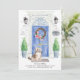 Announce your new address with our stylish announcement featuring a Havanese, blue front door, welcome mat, slate sign, topiaries and a floral wreath set on a grey brick background.