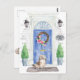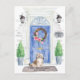 Announce your new address with our stylish announcement featuring a Havanese, blue front door, welcome mat, slate sign, topiaries and a floral wreath set on a grey brick background.