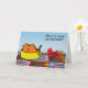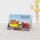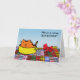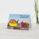 Have a Cosy Birthday! Adorable birthday paper greeting card. Cute cat in a yellow pan with a red bow on the handle. Illustration is colourful and bright with madras plaid fabric patterns under the pan and cat. Cat/pan element thanks to netrat/openclipart. © Shoaff Ballanger Studios.