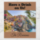 Have a Drink on Us! written in bold type across the top of the wine bottle label, with a beautiful picture of the cliff town of Cinque Terre Manarola. Under the image is a place to customise your name (or someone else's if it is a gift).