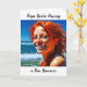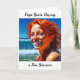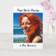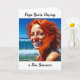 Cute card for a friend or family member who is away from the summer. Have a fun summer. Miss you. Pretty red head lady smiling at the beach.