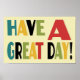 Colourful retro coloured graphic art design says "Have A Great Day!". Inspirational and motivational poster is great for lunch room, office, gym, classroom, library, family room, game room, on the door that you exit each day, reception area, choir room, church, club room, asb room, student government room, customer service area or anywhere that you want to promote a good message.