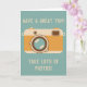 This bon voyage greeting card is perfect for photographers and old school shutterbugs with its illustration of a retro style camera in gold, brown and cream against a light aqua blue background. The front reads, "Have a great trip! Take lots of photos!" and the inside reads "Have a safe and happy journey!" But all the text on this card can be customised and personalised with your own message using the template fields.