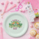 Paper plates with a St. Patrick's Day themed image. A retro grunge style design which says: Have a lucky day. With a colourful rainbow behind. Words written in a fat rounded retro style vibe. Pink and green colours.