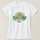 T-shirt with a St. Patrick's Day themed image. A retro grunge style design which says: Have a lucky day. With a colourful rainbow behind. Words written in a fat rounded retro style vibe. Pink and green colours.