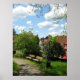 a small bench in a lovely green park in summer, a wonderful place for a rest. The red roofs of the small houses in background add to the serenity of this scene.