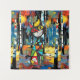 A whimsical cat with a geometric, stained-glass appearance stands in a vibrant forest of birch trees. The background features a colourful blend of autumn leaves and hues of blue and yellow. Digital Art Photoshop
