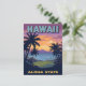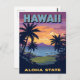 Bring the magic of the Aloha State to life with this stunning, vintage travel poster postcard! The design captures a breathtaking Hawaiian sunset (or sunrise) over the ocean, complete with dramatic palm tree silhouettes and distant mountains. The vibrant palette of orange, yellow, purple, and blue evokes a true tropical paradise. Featuring the bold text "HAWAII ALOHA STATE," this retro-style art is perfect for sending greetings, collecting as a souvenir, or framing as a piece of unique tropical wall art. A must-have for Hawaii lovers, beach enthusiasts, and anyone who dreams of island getaways.