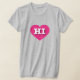 This t-shirt features a vibrant hot pink heart containing the bold, white, upper case letters HI, the official abbreviation for Hawaii, the aloha state.